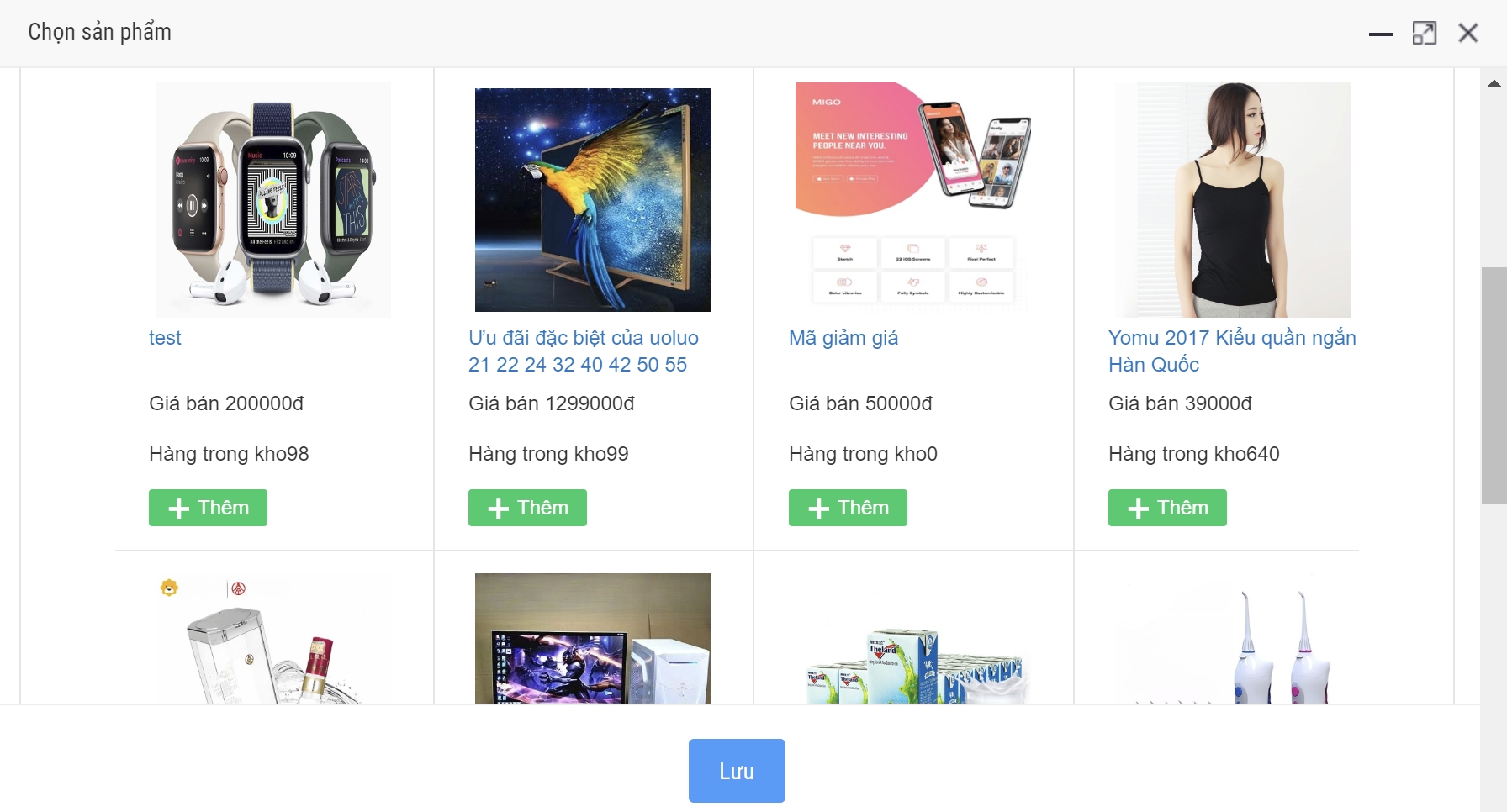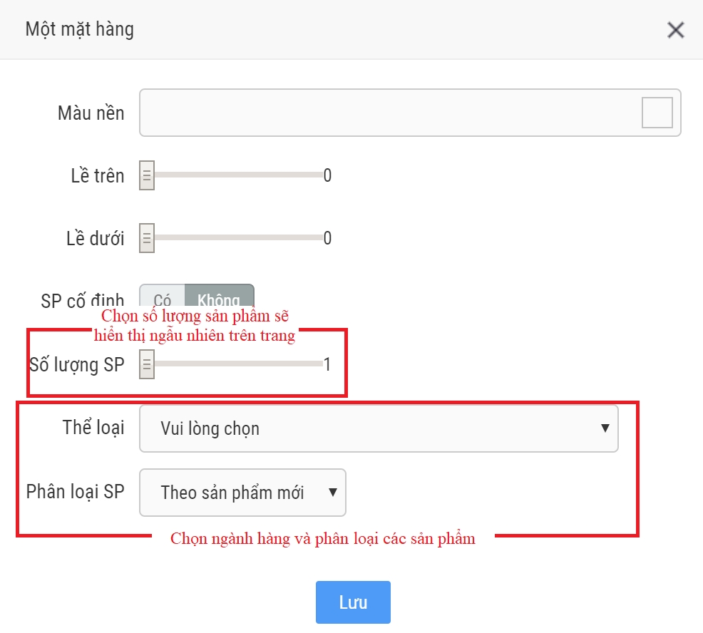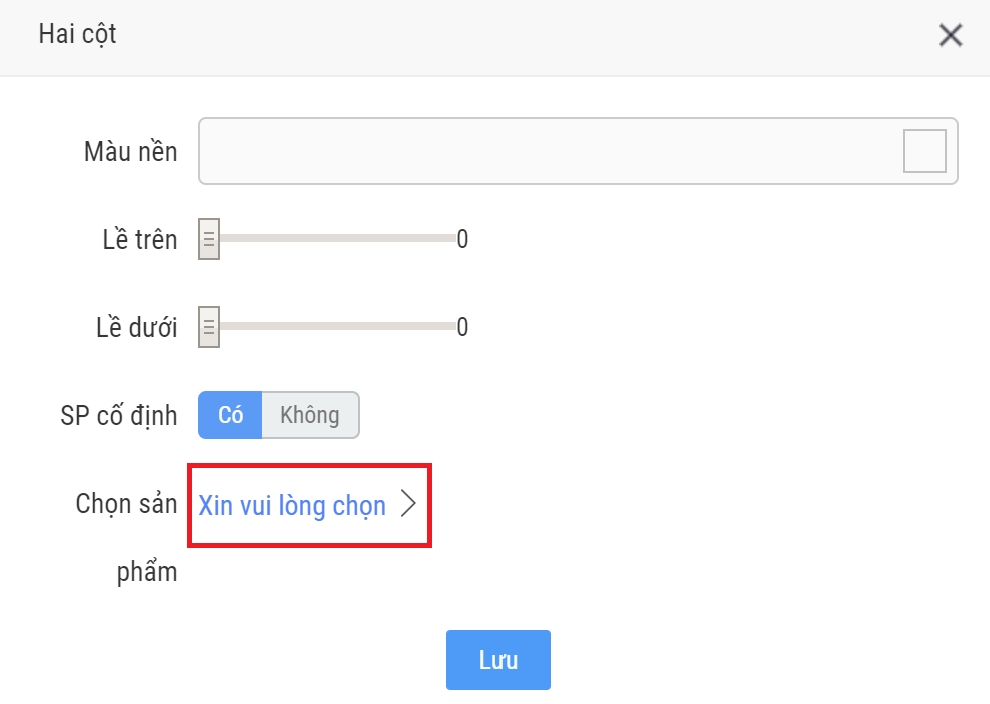 - Bước 3: Chọn Màu nền của trang, kích thước các lề và lựa chọn tùy chọn Sản phẩm cố định để thêm lên trang hay không (Nếu chọn Sản phẩm cố định người dùng dùng sẽ phải chọn ra các sản phẩm cần thêm vào trang)