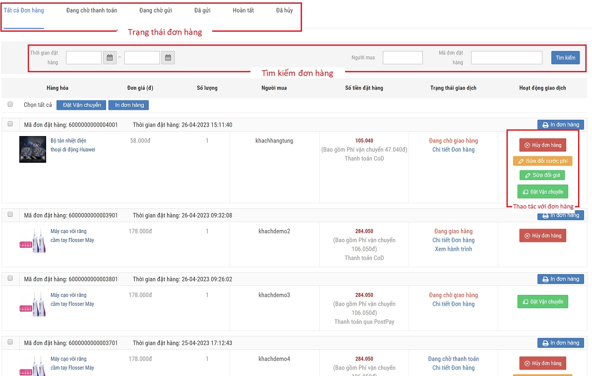 Từ trang danh sách đơn hàng, khách hàng có thể quản lý, thao tác và tìm kiếm các đơn hàng đã được đặt