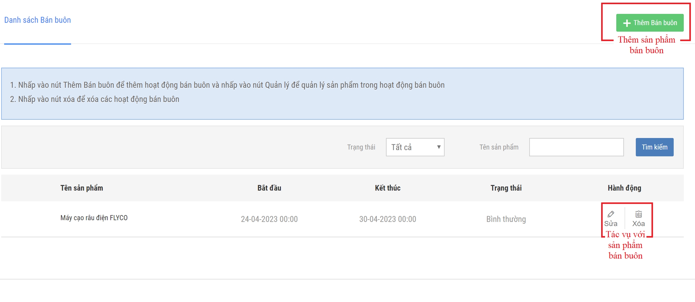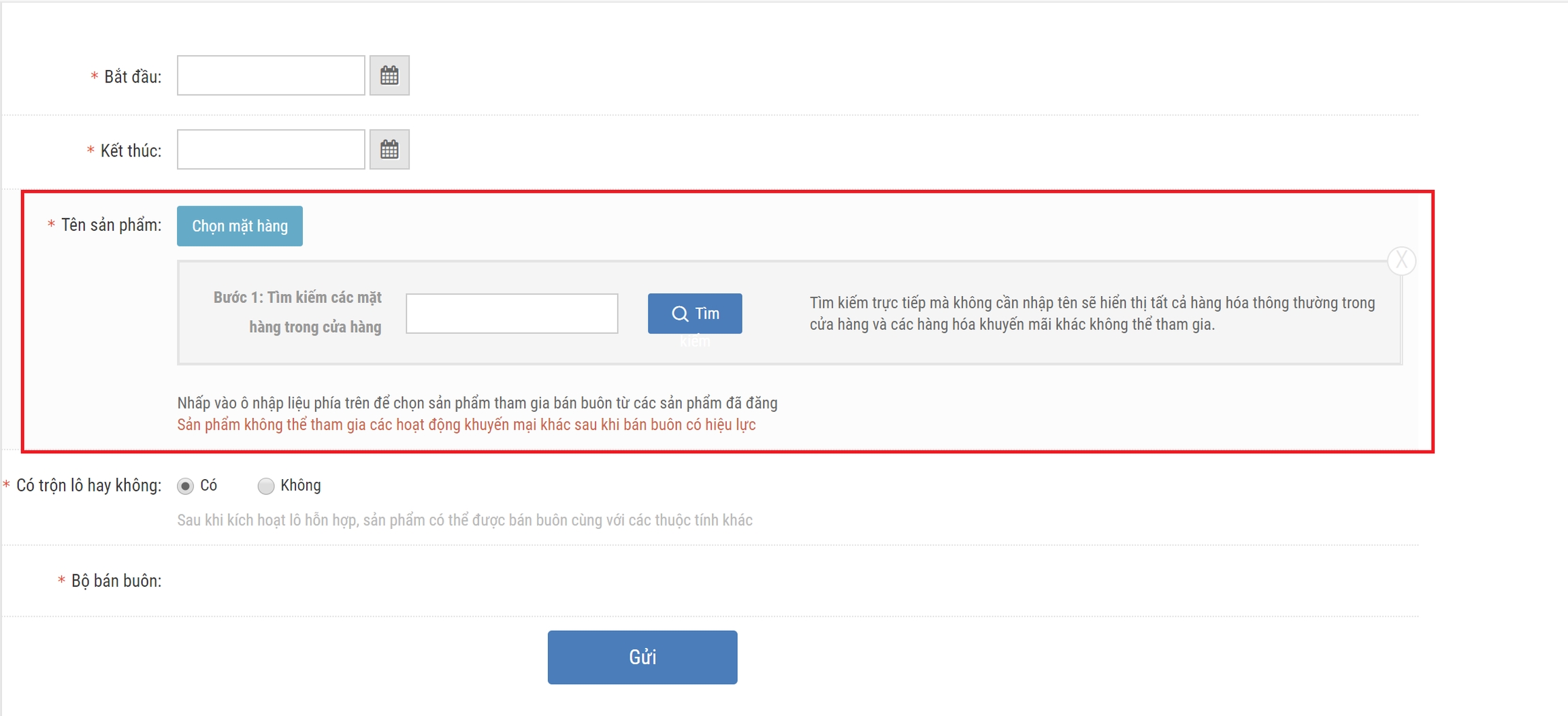 - Bước 1: Chọn ngày bắt đầu và ngày kết thúc bán buôn