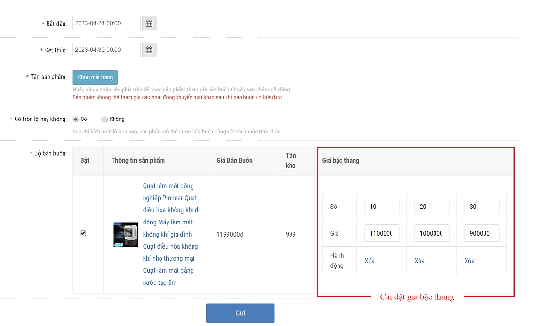 - Bước 3: Lựa trọn trộn lô hay không (Bán xen lẫn các thuộc tính như màu sắc, kich thước,..), sau đó cài đặt các mức giá bậc thang theo số lượng