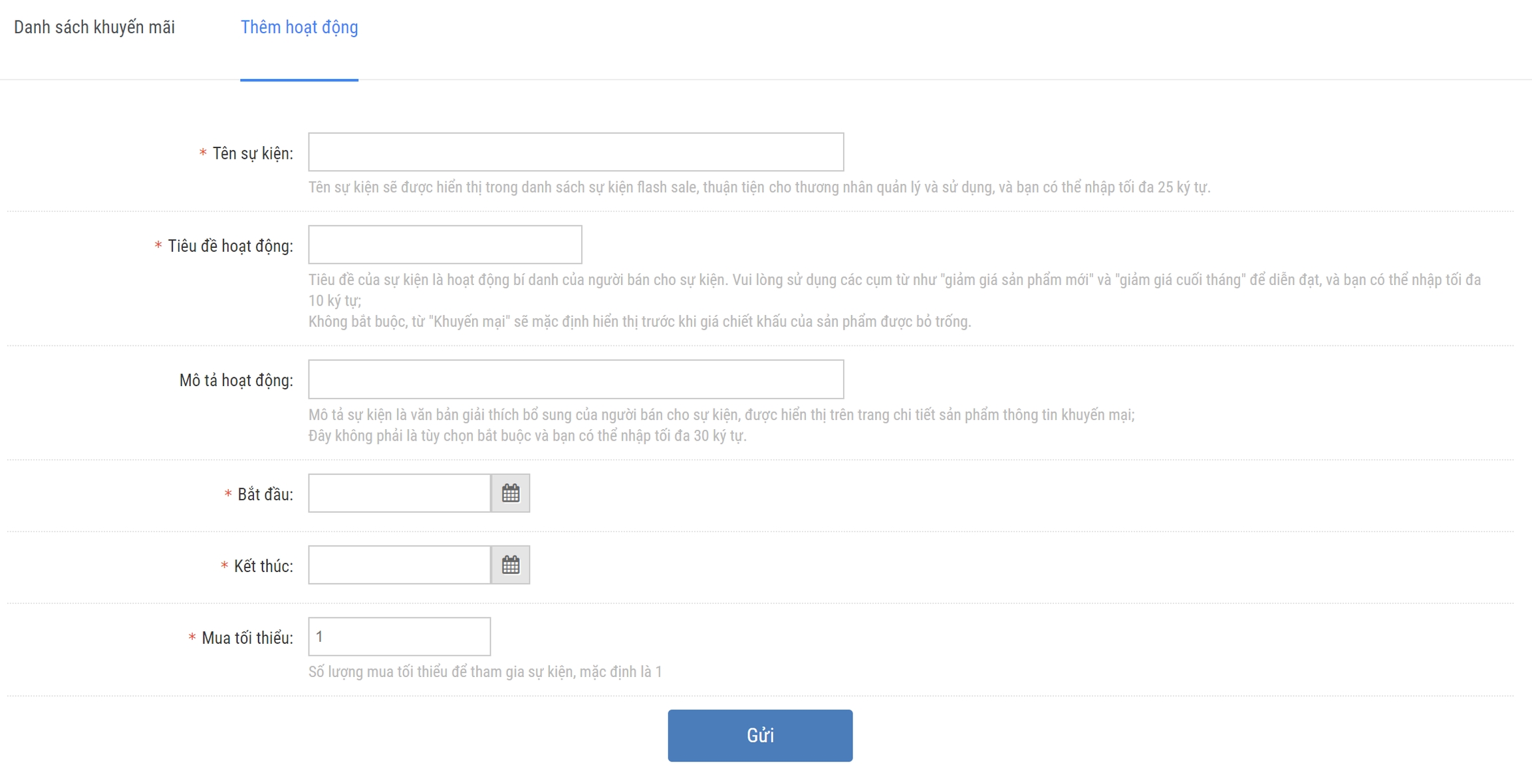 - Bước 1: Điền chi tiết các thông tin của sự kiện giảm giá , chọn ngày bắt đầu và kết thúc của sự kiện, nhập số lượng mua tối thiểu để áp dụng giảm giá và chọn nút "Gửi"