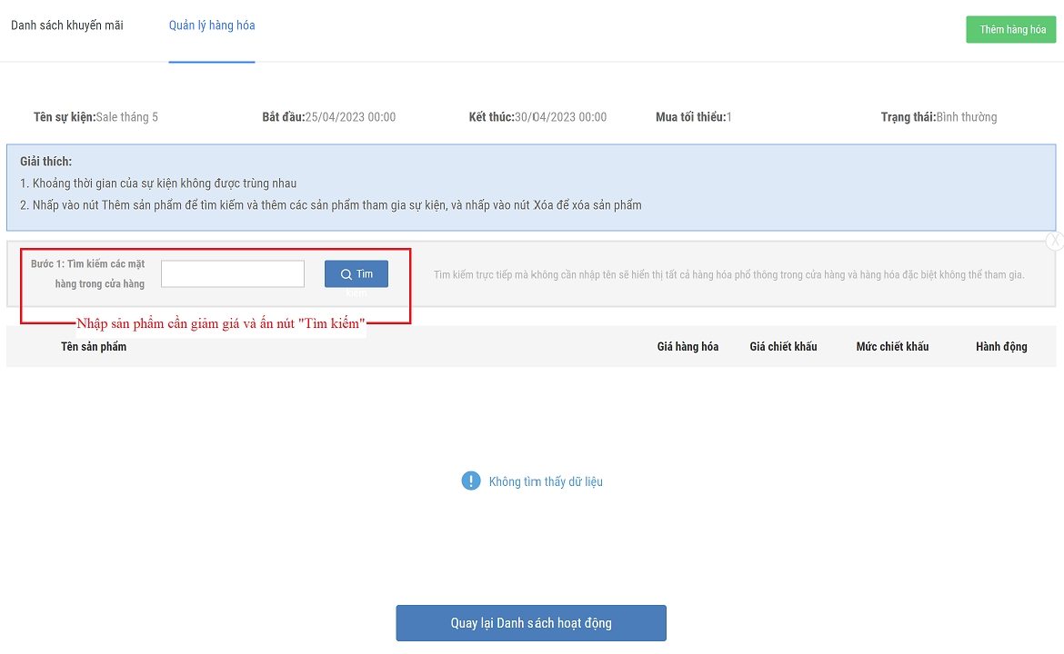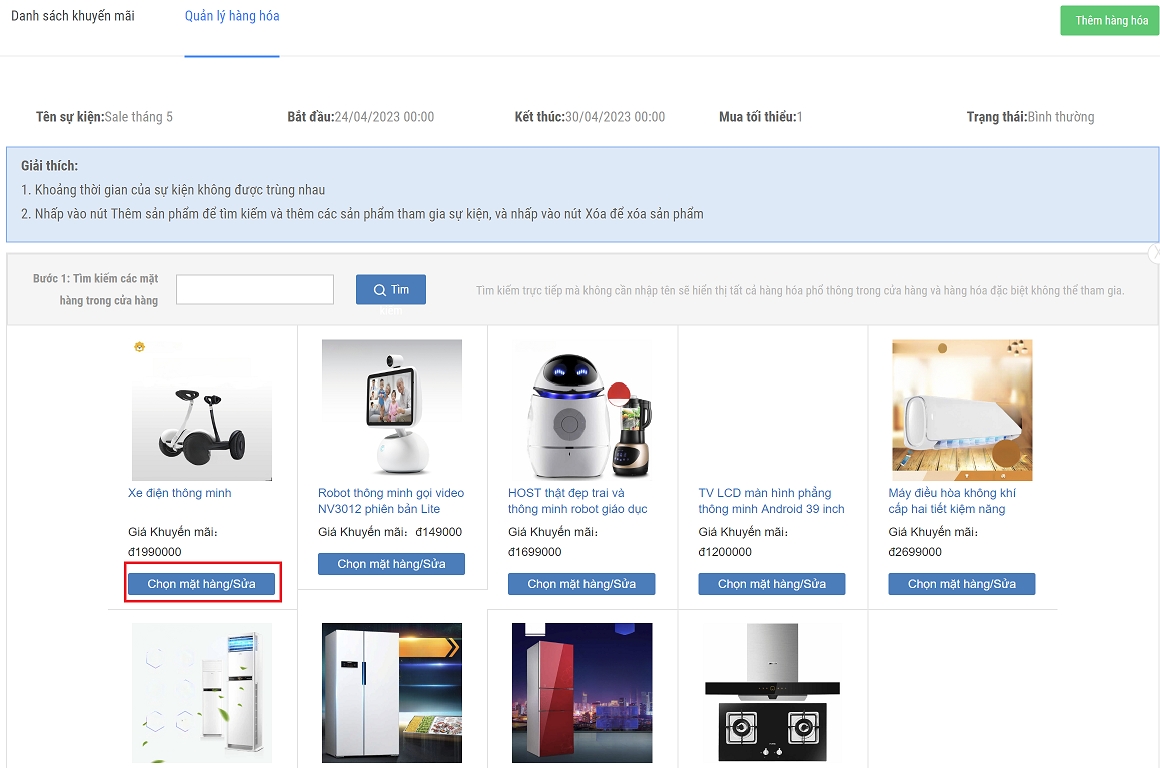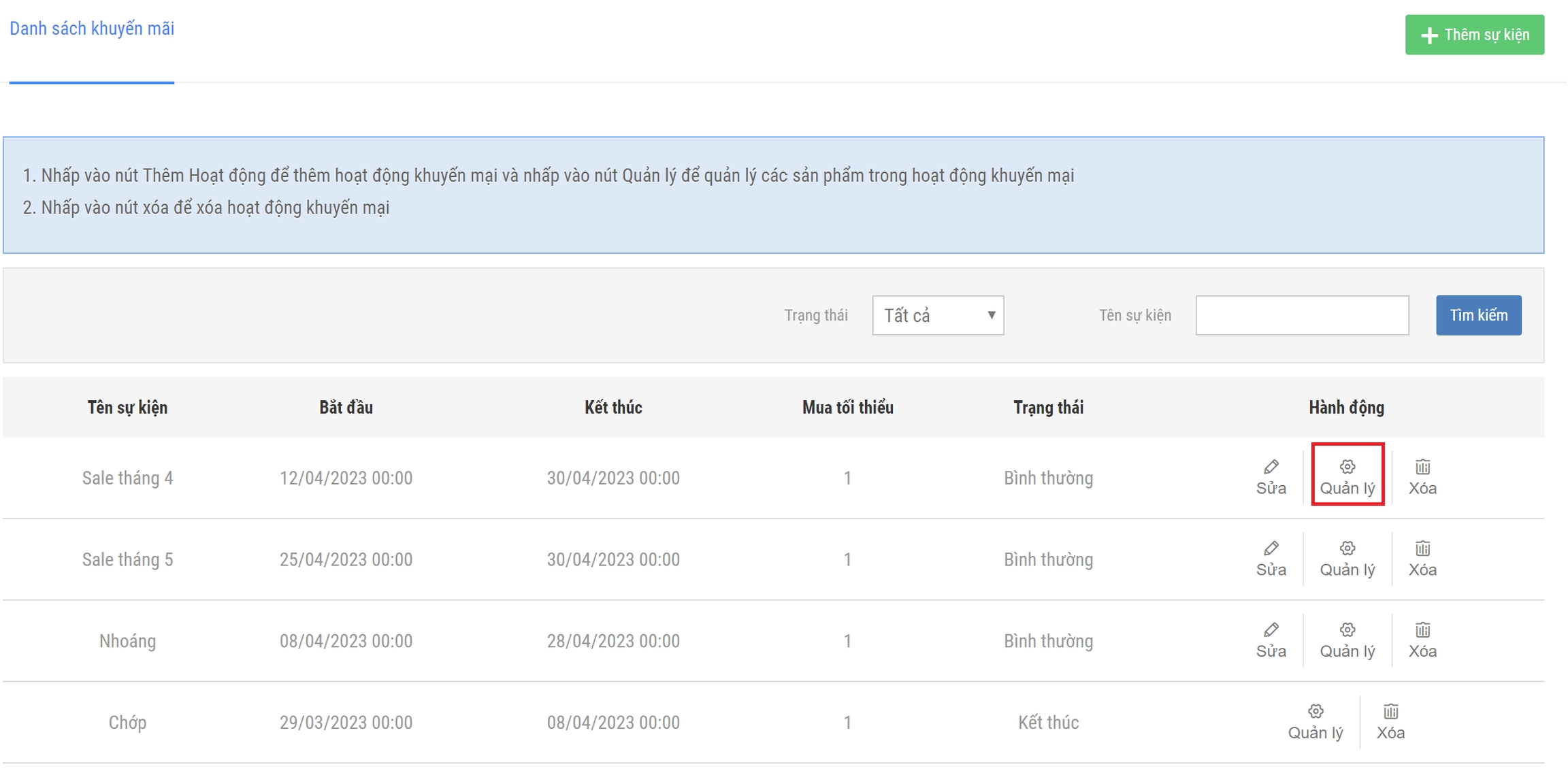 - Bước 2: Sau khi tạo, sự kiện sẽ được hiển thị trên danh sách, nhấp vào nút "Quản lý" và "Thêm hàng hóa" để thêm sản phẩm vào sự kiện giảm giá