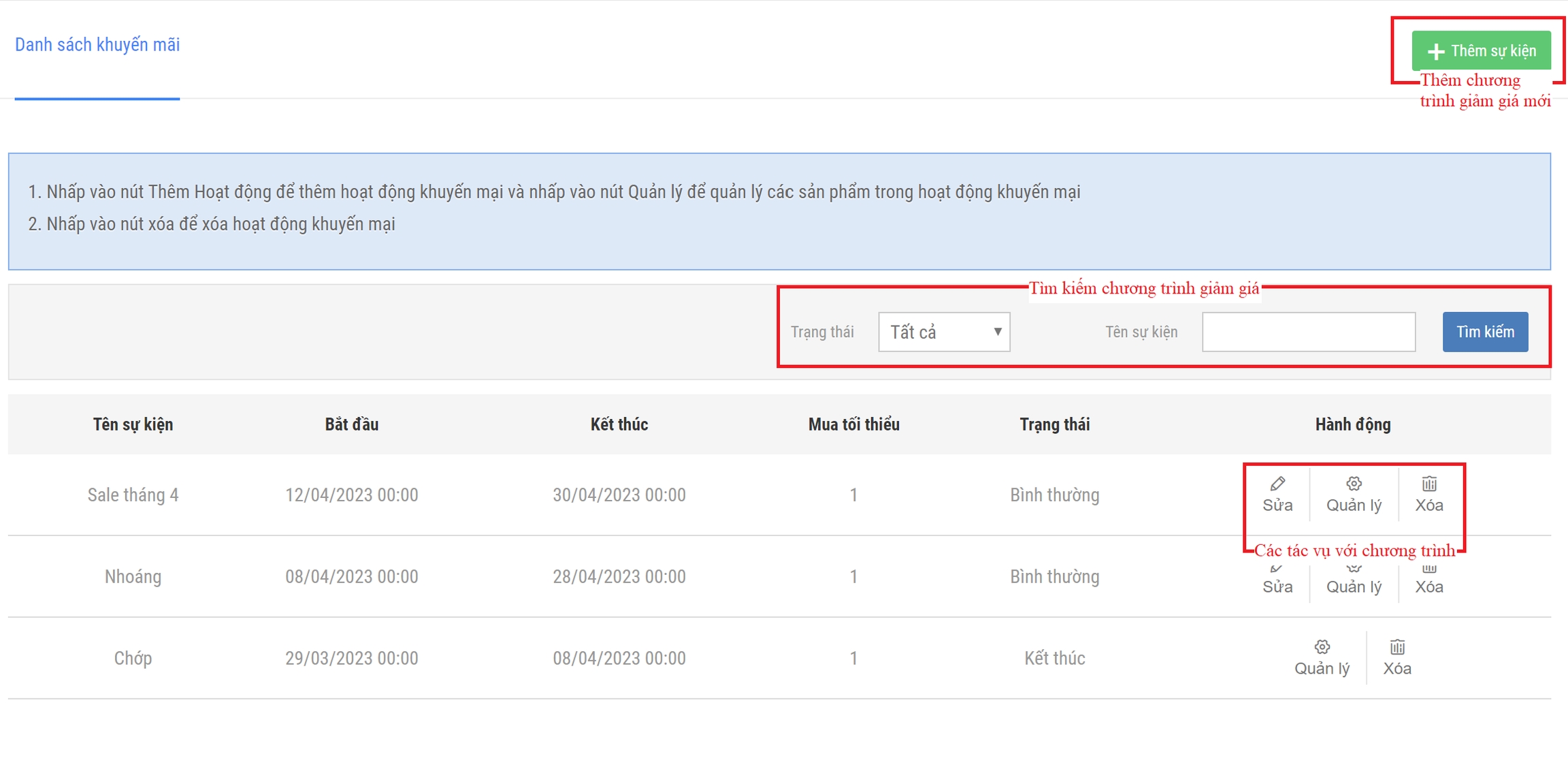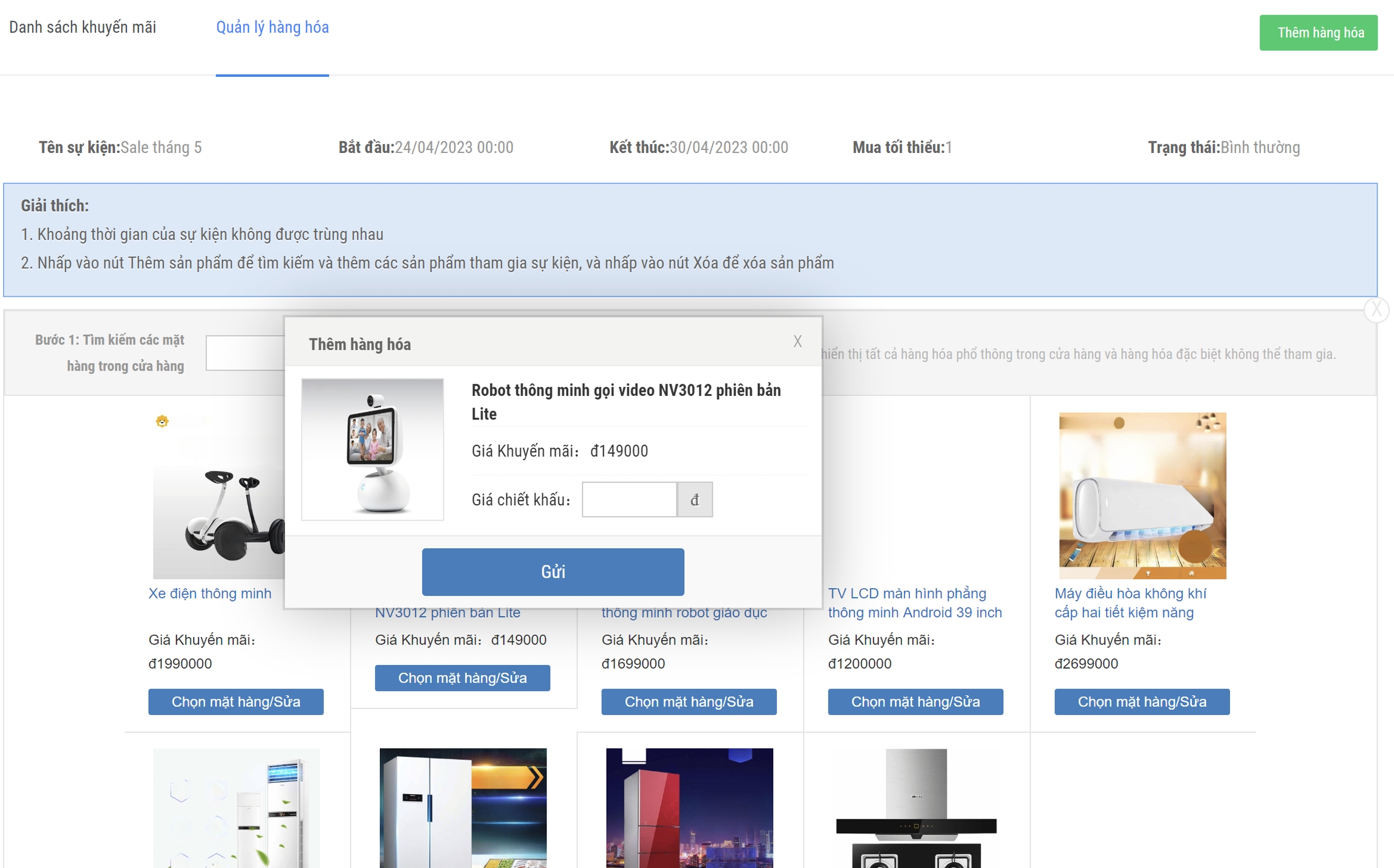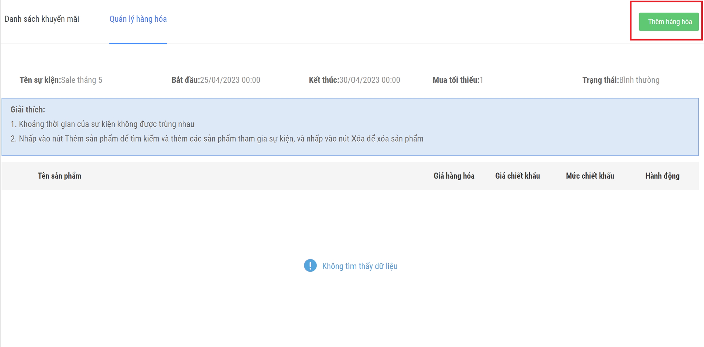 - Bước 2: Sau khi tạo, sự kiện sẽ được hiển thị trên danh sách, nhấp vào nút "Quản lý" và "Thêm hàng hóa" để thêm sản phẩm vào sự kiện giảm giá